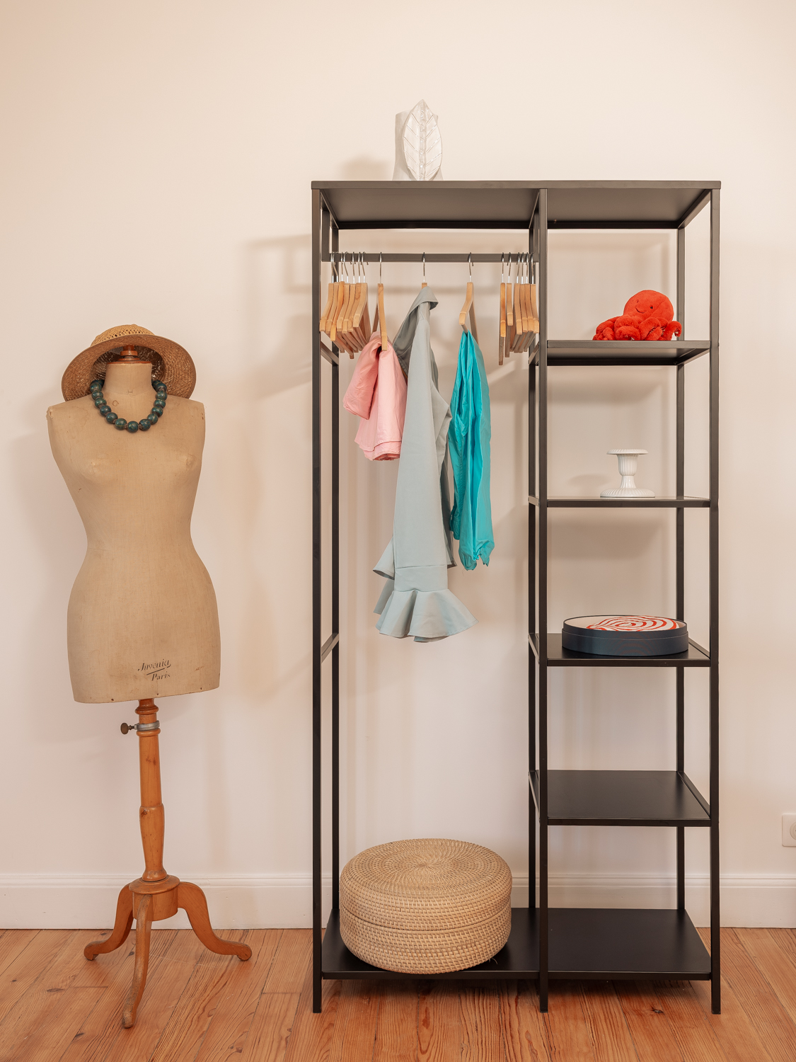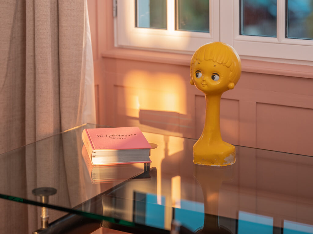 Le bureau LC6 est signé Le Corbusier et s’accompagne d’une chaise japonaise. On y trouve deux têtes à chapeau Twiggy jaune et noire des années 60.